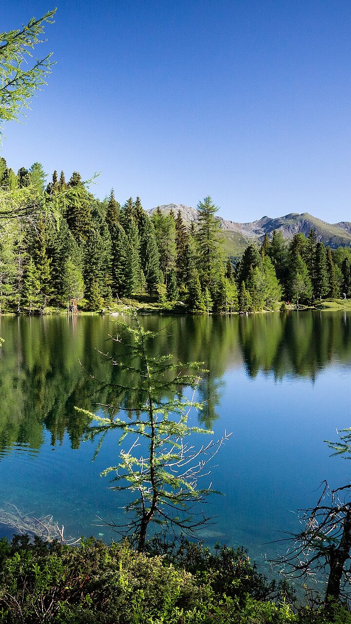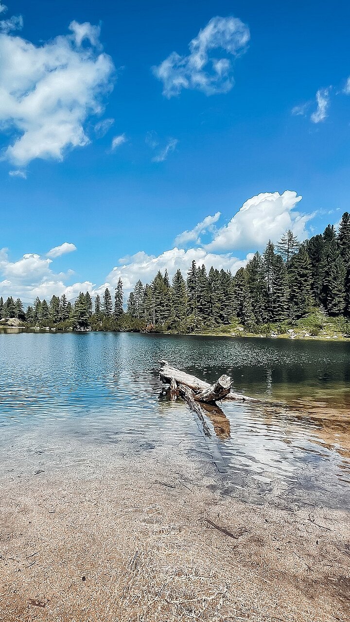 Ein einsamer Bergsee umgeben von Wald, Berggipfeln und Ruhe. Freibad deluxe.