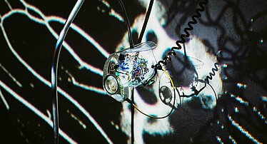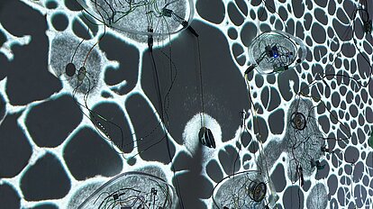 Auf dem Gebäude befinden sich viele kleine, analoge Schaltkreise, welche Daten wie die Wetterbedingungen oder die Bewegungen von Passant*innen aufnehmen und sammeln. Das digitale Pilzgeflecht nutzt diese Daten, um sich an die Umgebung anzupassen und verändert dadurch sein Aussehen (die Projektion) und jene der Fassade ständig.