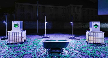 Für das Water Light Festival 2024 entwickelt TENTAKULUM die Arbeit Green Washing, welche sowohl tagsüber als auch nachts vor dem Gebäude von Brixen Tourismus zu sehen sein wird wird. Die Installation besteht aus zwei Waschmaschinen und zwei IBC Wassertanks, sowie einem langen Schlauchsystem. Dieses verbindet die beiden Maschinen und die Tanks miteinander, wie Tentakeln. In den Schläuchen zirkuliert mit Uranin angereichertes, hellgrünes Wasser. Nachts bringen UV-Lampen vor der Installation das Ganze zum Leuchten.