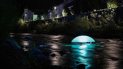 AliPaloma und Hartwig Thaler erzählen in ihrer Installation und Performance von der physikalischen wie geistig-magischen Kraft des Wassers. Dieses Leuchtobiekt erzählt einerseits von der Möglichkeit, Wasserkraft in elektrische Energie umzuwandeln und ist andererseits Sinnbild für die besondere spirituelle Kraft, die vom Wasser ausgeht. Die Leuchtlinse ist auch Sinnbild für die spirituelle Kraft, die vom Wasser ausgeht. Der Fluss ist ein kraftvoller Freund, er ist die Ruhe im Bewegten, er gibt den Menschen Licht. Performer*innen tragen in Ufernähe dieses Licht mit sich, es strömt durch ihren Geist und ihren Körper. Sie stehen in Verbindung mit der Leuchtlinse und versinnbildlichen zusammen die vielfache Kraft des Wassers.