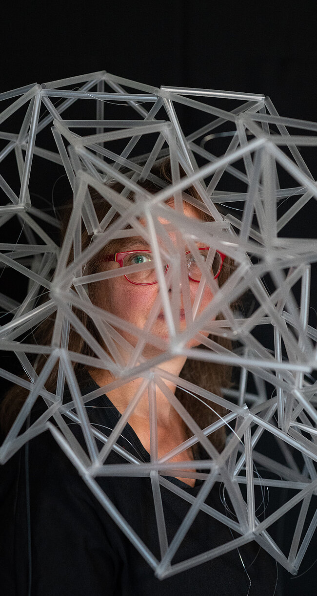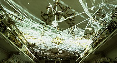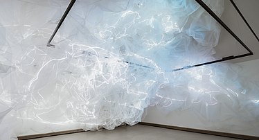 Die textile Skulptur besteht aus unzähligen Metern von feinmaschigem Textil, das an manchen Stellen locker gelegt, an anderen dicht geschichtet ist. Im Wechselspiel mit animierten und projizierten Grafiken entstehen optische Interferenzen. Sie machen eine Vielfalt von Opazitätsgraden sichtbar und generieren eine ätherische Ästhetik, die an Wasser, Nebel oder Wolken erinnert.