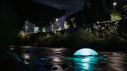 In their installation and performance, AliPaloma and Hartwig Thaler tell of the physical and spiritual-magical power of water. On the one hand, this luminous object tells of the possibility of converting water power into electrical energy and, on the other, it is a symbol of the special spiritual power that emanates from water. The river is a powerful friend, it is the calm in the moving, it gives light to people. Performers carry this light with them near the shore, it flows through their mind and body. They are in connection with the luminous lens and together symbolise the multiple power of water.